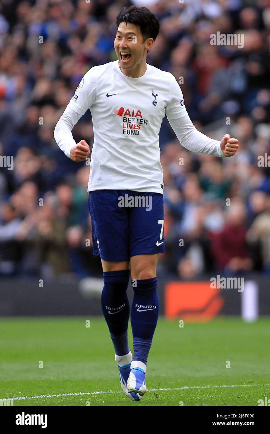 London Grossbritannien 1 Mai 2022 Son Heung Min Von Tottenham Hotspur Feiert Nachdem Er Seinen Teams 2 Tore Schiesst Premier League Spiel Tottenham Hotspur Gegen Leicester City Im Tottenham Hotspur Stadium In London